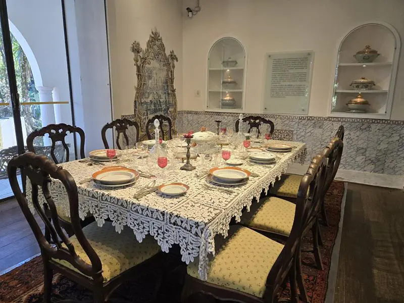 A visita começa já na varanda de entrada, com parte da coleção de louças portuguesas fabricadas no século XIX. Belíssima. Em seguida ao entrar na recepção há uma exposição sobre Raymundo Castro Maya, colecionador, ecologista, esportista, empresário e patrono do museu.